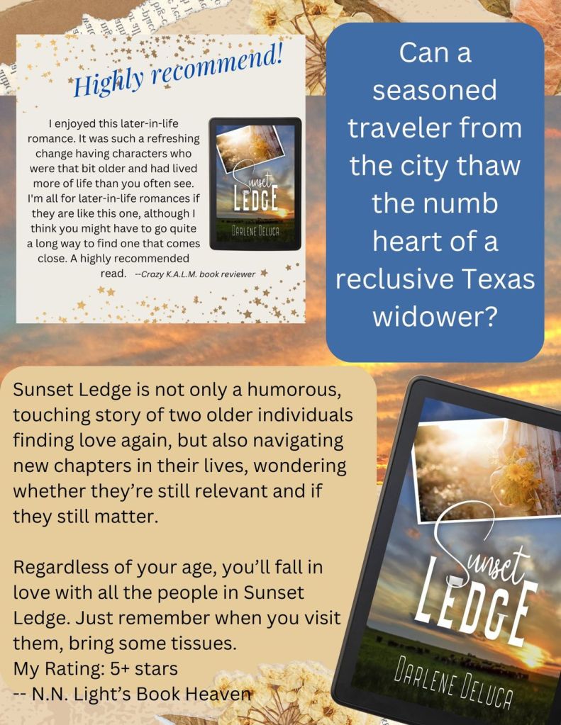 Today’s Book in the Spotlight is Sunset Ledge, by Darlene Deluca. Look no further for your next read than this later-in-life romance novel set on a Texas Ranch.